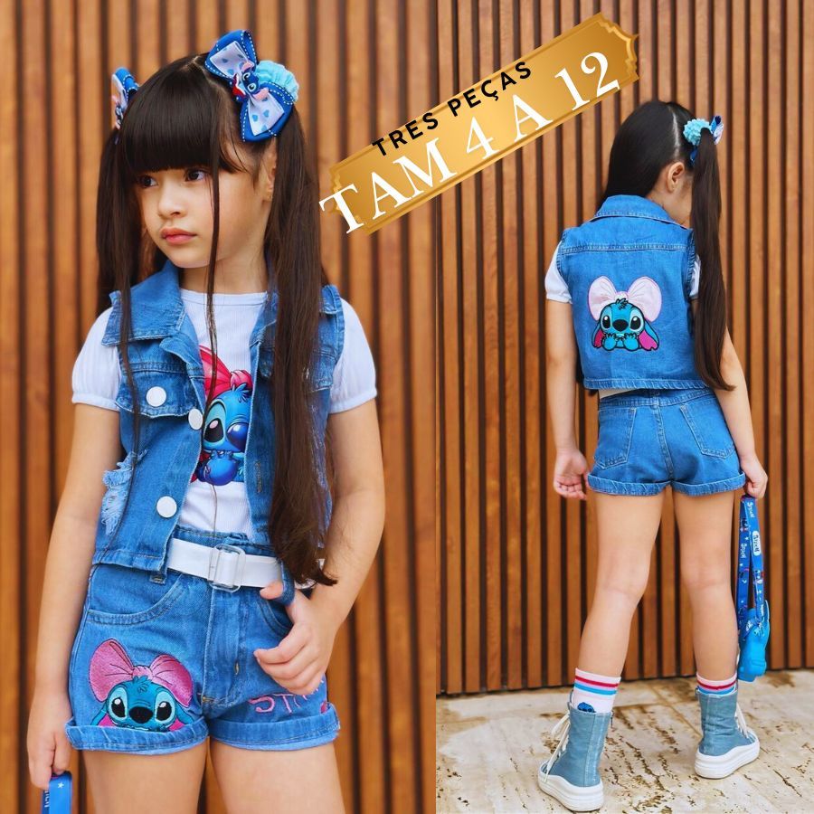 Conjunto Infantil Menina Bloguerinha Colete Jeans + Blusa Ribana + Short Jeans * Cinto 4 a 12
