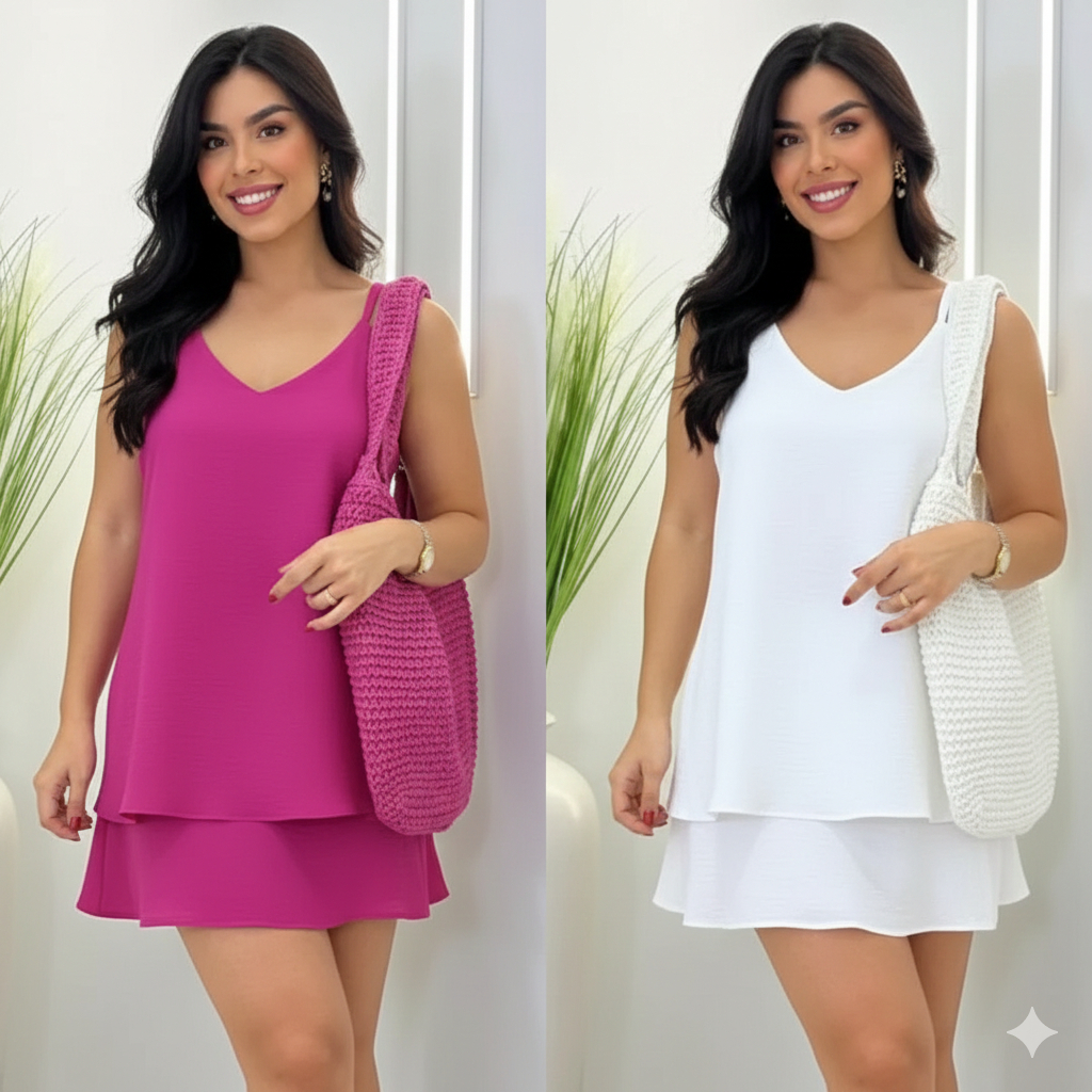 Kit 2 Vestidos Femininos Tecido Duna Alça Regulável e Barra em Camadas Elegante e Confortável.