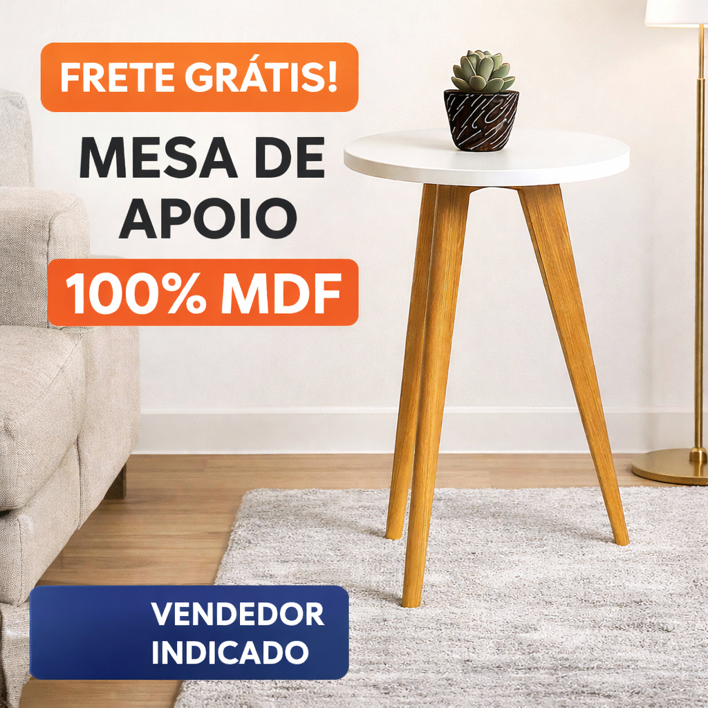 Mesa de Apoio Decorativa – Topo Branco e Pés Pinus | Ideal para Sala, Quarto ou Escritório